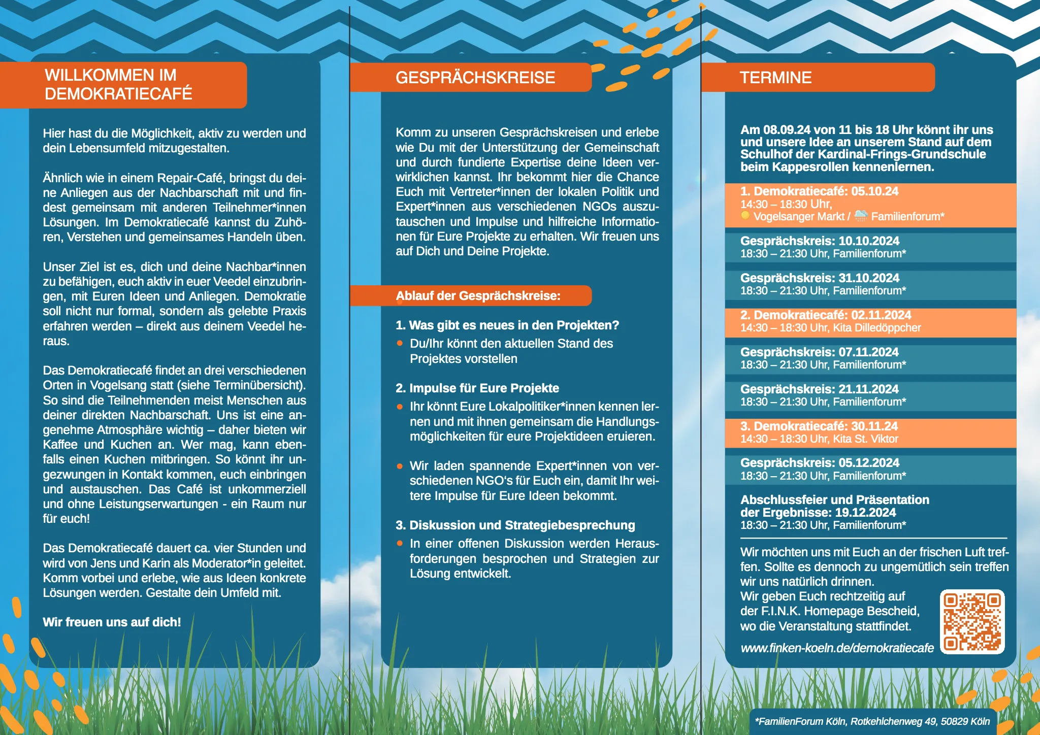 Die bisherigen Demokratiecafés und Gesprächskreise zeigen, dass es in Vogelsang viele engagierte Menschen mit kreativen Ideen gibt. Mit dem nächsten Demokratiecafé am 30. November 2024 und weiteren Gesprächskreisen am 07.11.2024, 21.11.2024 und 05.12.2024 bieten wir allen Vogelsanger*innen erneut die Gelegenheit, ihre Anliegen einzubringen und gemeinsam mit anderen an Lösungen zu arbeiten.